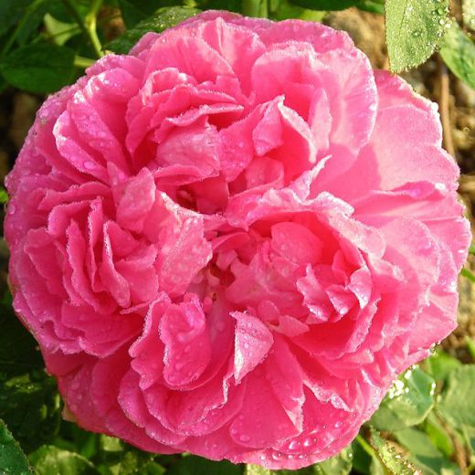 Grosses fleurs très doubles, rose franc, parfumées. Rosier remontant