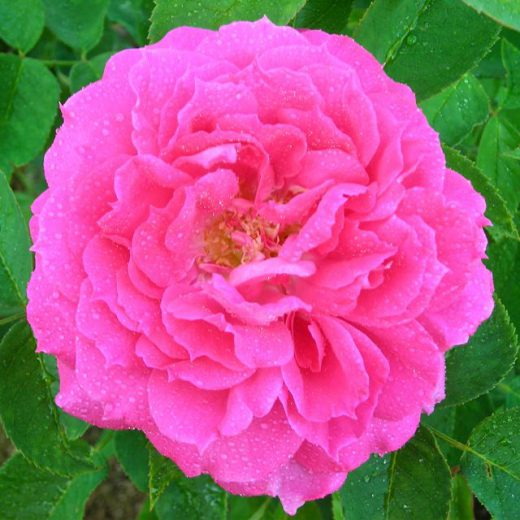 Fleurs bien doubles, rose foncé rougeâtre, parfumées.Rosier non remontant